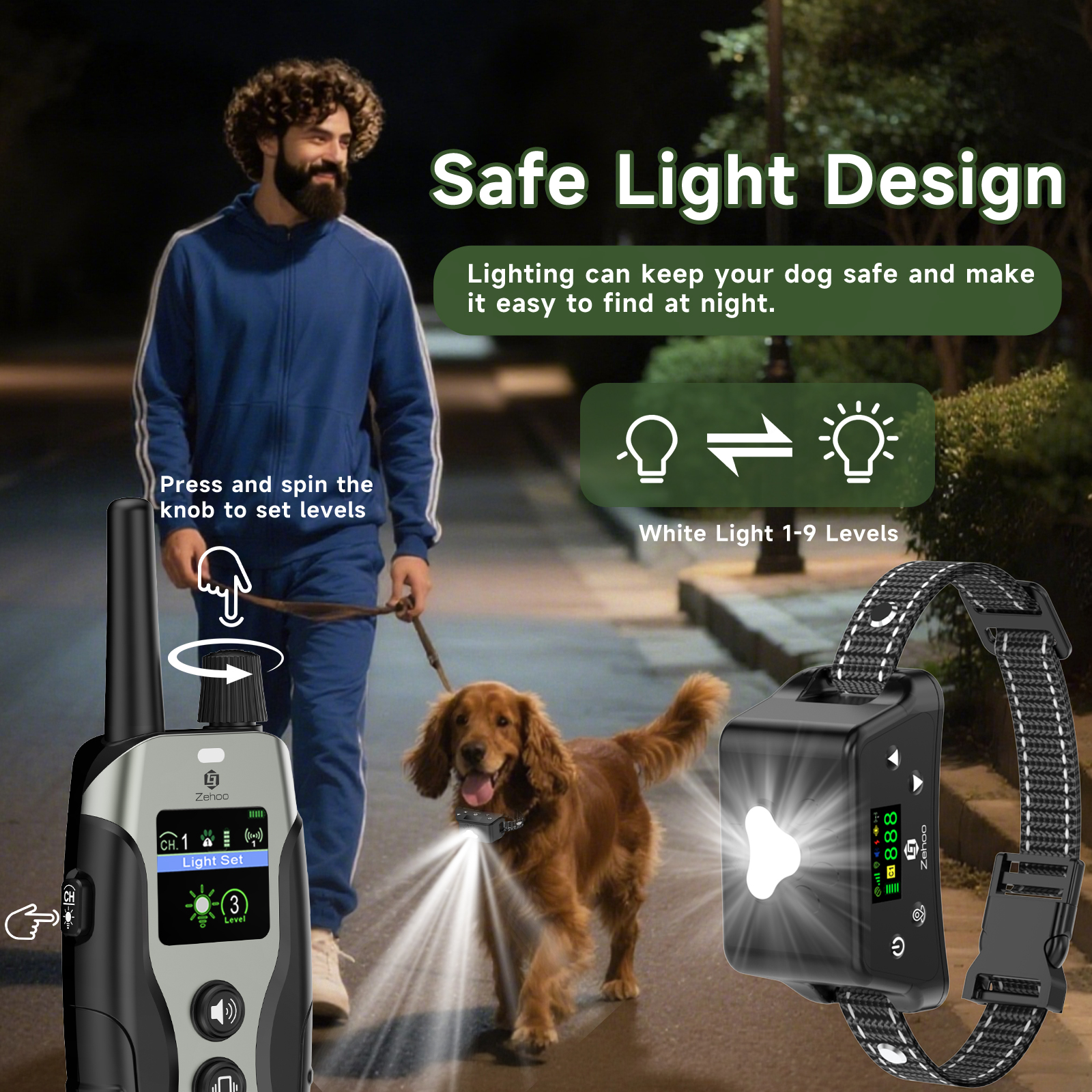 - [GPS Wireless Fence Collar with White Light] 1-9 level adjustable lights, very practical for camping or night walking, just turn on the lights remotely, can easily find your dog or keep them on to navigate the road at night.