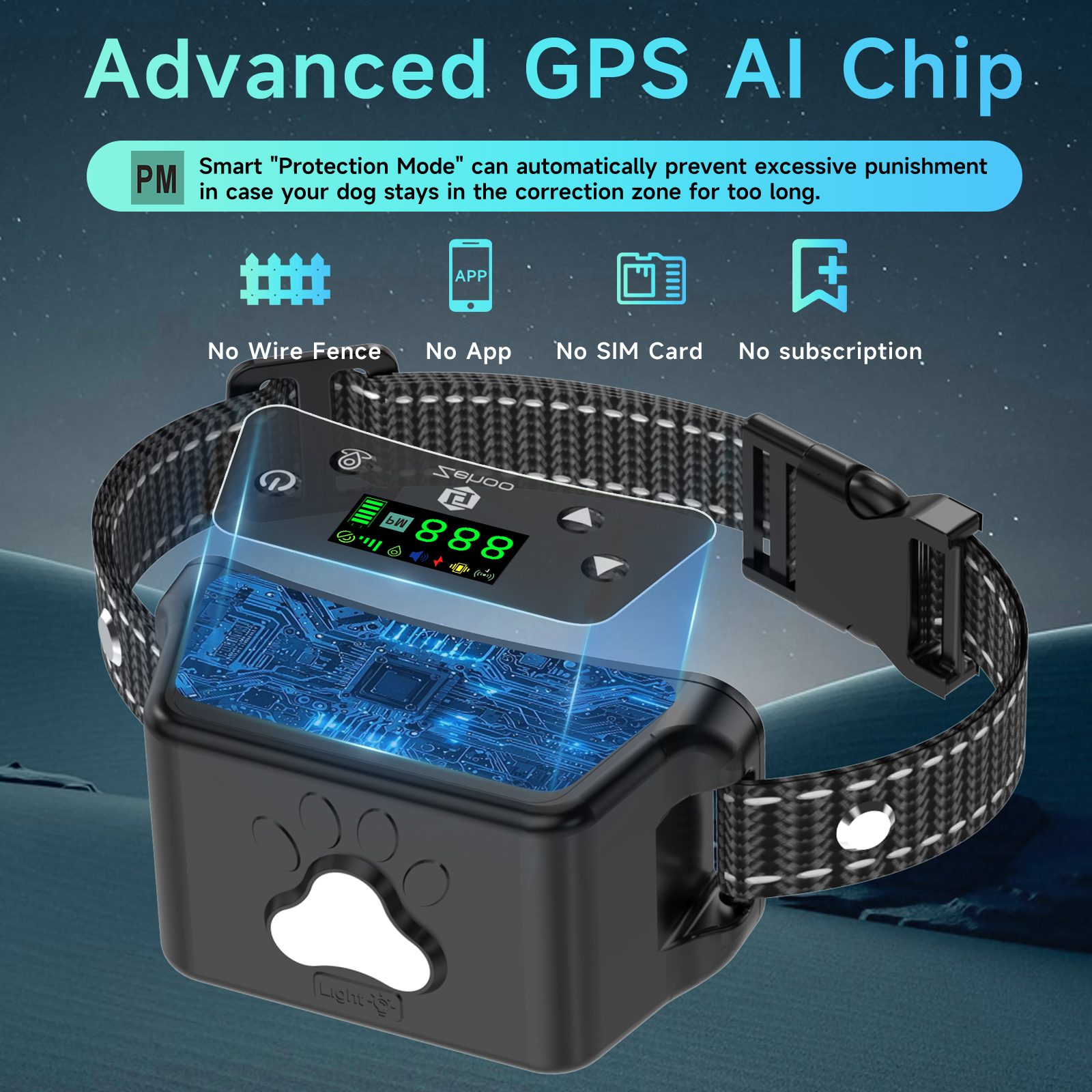 - [Adopting the new generation of GPS AI chip] The GPS wireless fence collar adopts the new generation of advanced GPS AI chip, with ultra-high sensitivity and anti-interference ability, accurate real-time positioning, and effective training your dog not to cross the wireless fence behavior, so as to ensure that your beloved dog can move within the set safe area.