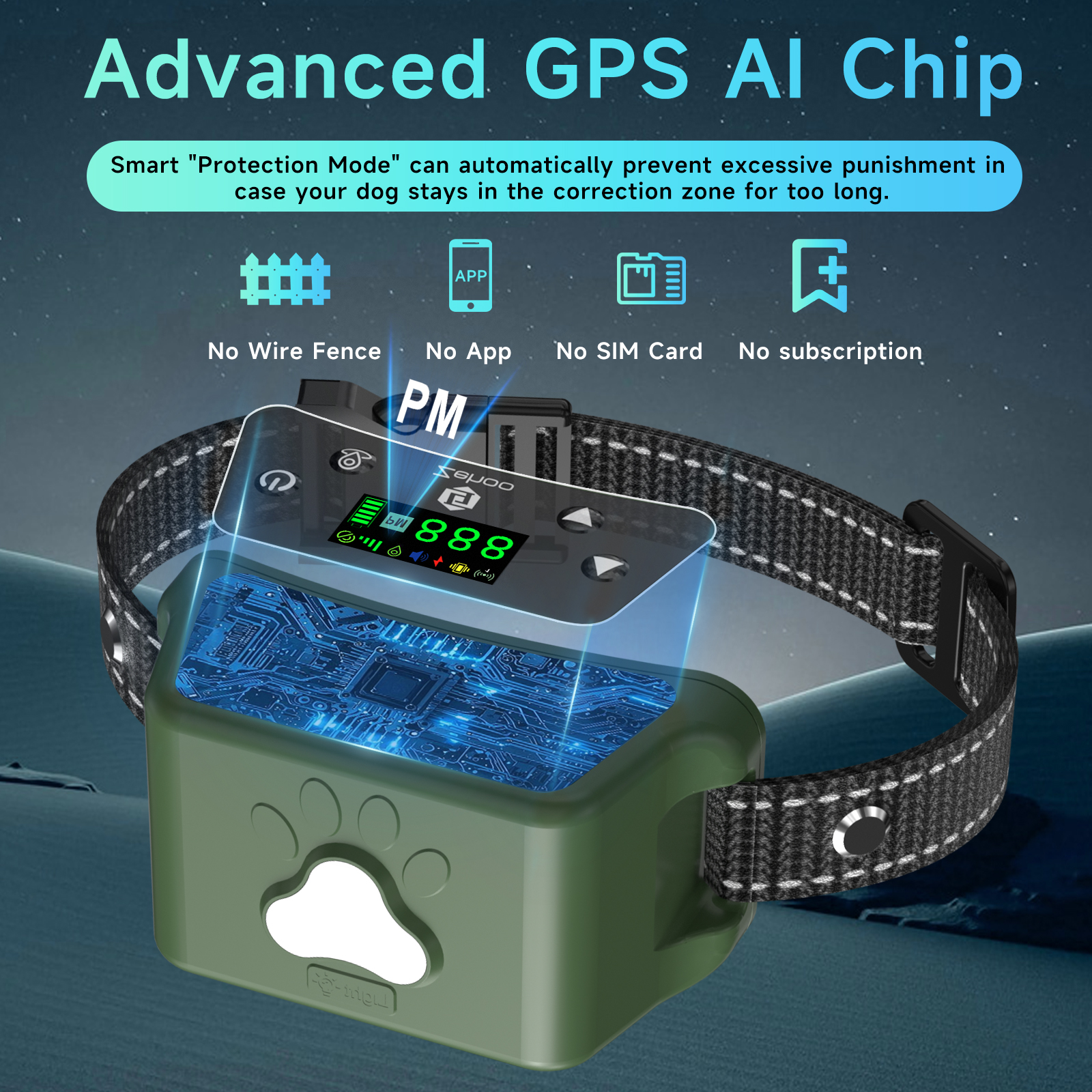 • [Adopting the new generation of GPS AI chip] The GPS wireless fence collar adopts the new generation of advanced GPS AI chip, with ultra-high sensitivity and anti-interference ability, accurate real-time positioning, and effective training your dog not to cross the wireless fence behavior, so as to ensure that your beloved dog can move within the set safe area.